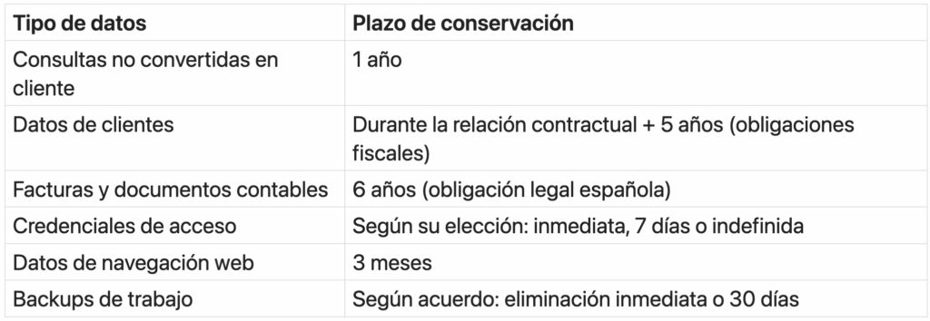 Si durante la prestación del servicio tengo acceso a datos personales de sus clientes o usuarios, actuaré como Encargado del Tratamiento. Podemos formalizar un Contrato de Encargo de Tratamiento según el Art. 28 RGPD si lo solicita.
